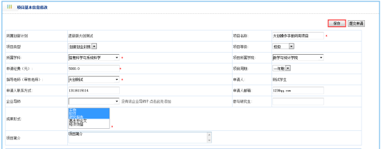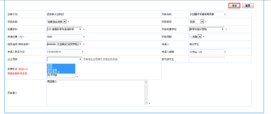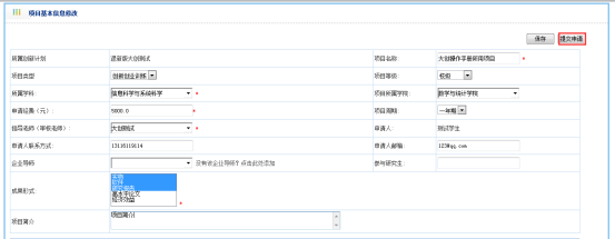 学生申请的创新创业项目通过审核后,可以根据项目实施情况填写进度完成信息,如图: