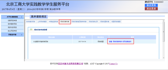 学生如果创新创业项目有所变更,可以提交项目变更申请,相关部门进行审核。项目变更分为:内容变更、成员变更、指导老师变更、项目延期、项目终止。如图: