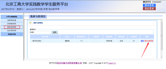 当学生所参与的项目(学生是参与人而不是负责人)被驳回到学生处时,学生在我参与的项目处可以查看项目的信息,而且还可以退出当前项目,如图: