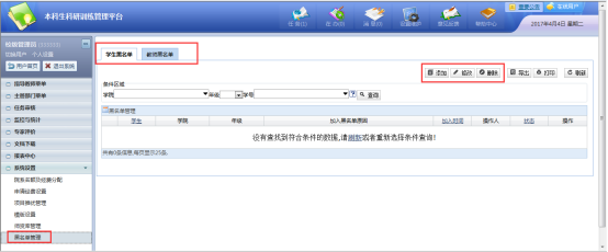 主管部门管理人可以在黑名单管理中对学生或指导教师进行黑名单操作,添加黑名单后,该学生或指导教师将不能进行创新创业业务,如图: