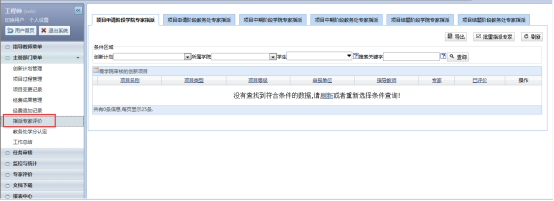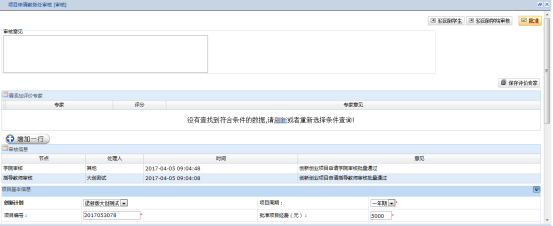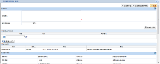 在审核过程中,可以添加评价专家,以便查看评价专家对项目的评价,评价专家评价结束后学院可以继续审核,如图: