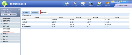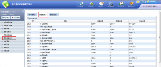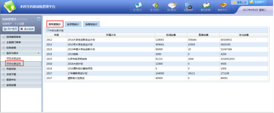 又能对项目经费进行监控,可分为按年度统计、按学院统计、按等级统计如图: