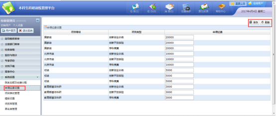 如果在此处对于特定项目级别的项目类型进行了经费设置,学生在申请项目时符合此处条件的项目的申请经费会变为一个固定值,具体数字为此处设置的数字;如果在此处没有特定设置,则在申请项目时申请经费由学生来填写。