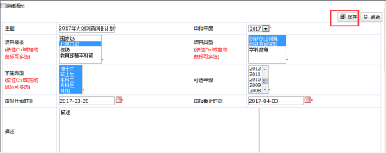主管部门管理员在每个管理年度添加创新计划,发布完创新计划后,学生在规定的时间就可以申报创新创业项目,如图: