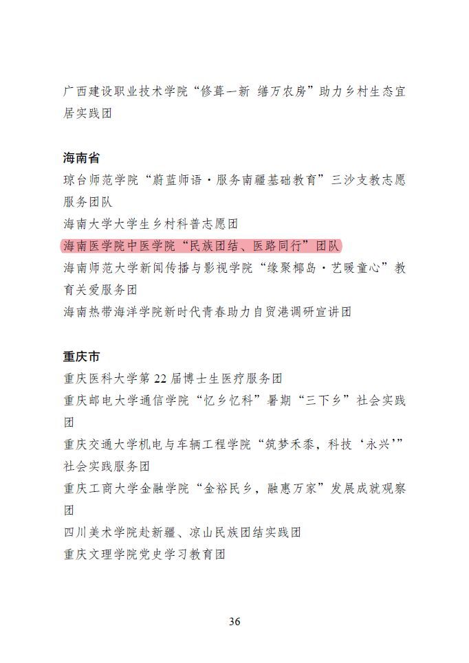 近日,2022年全国大中专学生志愿者暑期文化科技卫生“三下乡”社会实践活动总结通报结果公布,海南医学院中医学院“民族团结、医路同行”团队获“全国暑期三下乡社会实践优秀团队”。